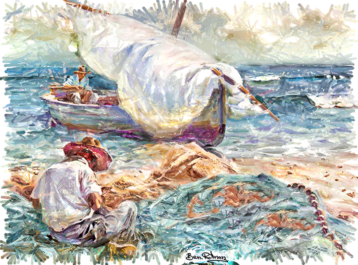 דייג מתקן את הרשת,ציור שמן, לבית, לסלון, למשרד, בהתאמה אישית